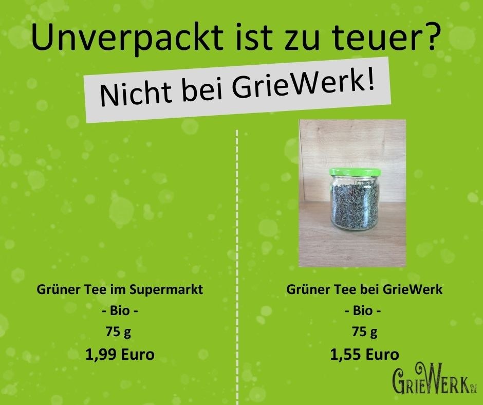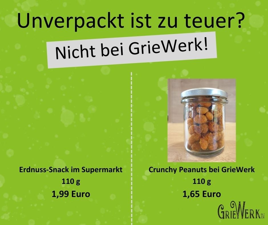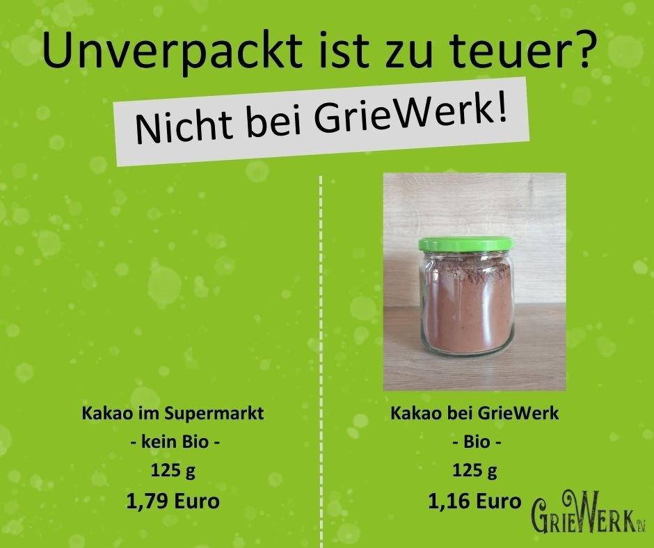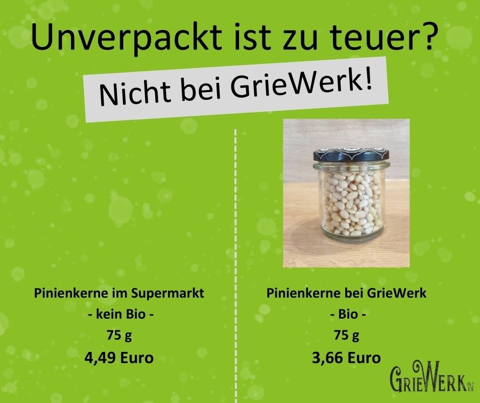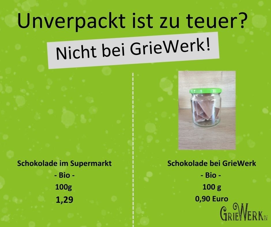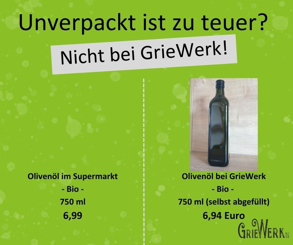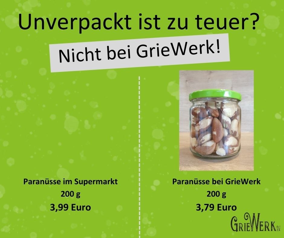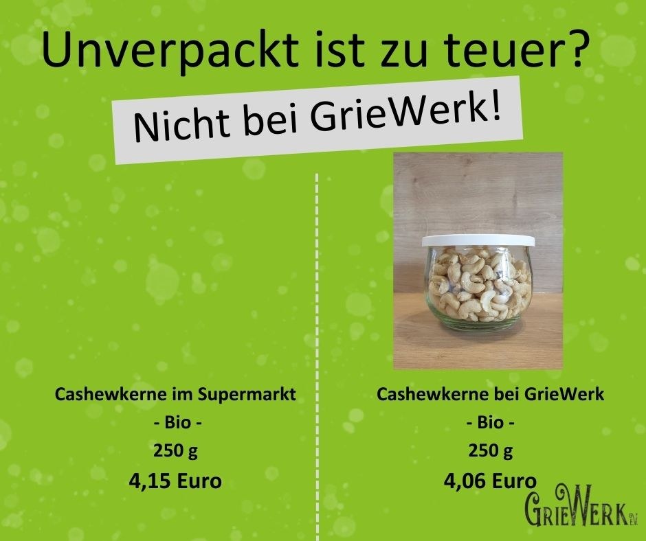 Viele denken, es sei zu teuer, im Unverpacktladen einzukaufen. Doch bei GrieWerk vermeiden wir hohe Kosten und deshalb können wir den Einkaufspreis mit einem geringen Zuschlag direkt an euch weitergeben. Viele Lebensmittel sind deshalb bei uns sogar günstiger als im Supermarkt - zumindest, wenn ihr Bio mit Bio vergleicht und nicht Äpfel mit Birnen.